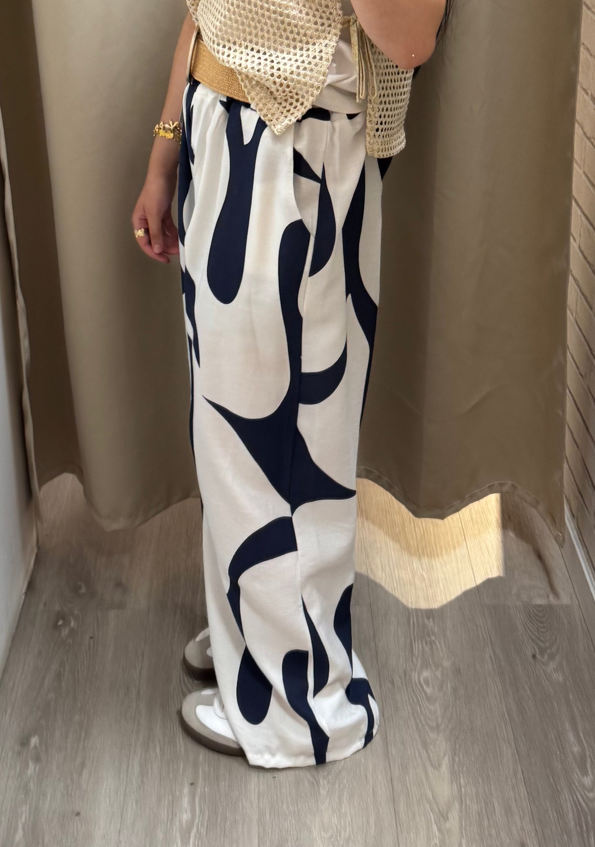 Pantalon wide leg longue Imprimé abstrait avec ceinture avec poches.